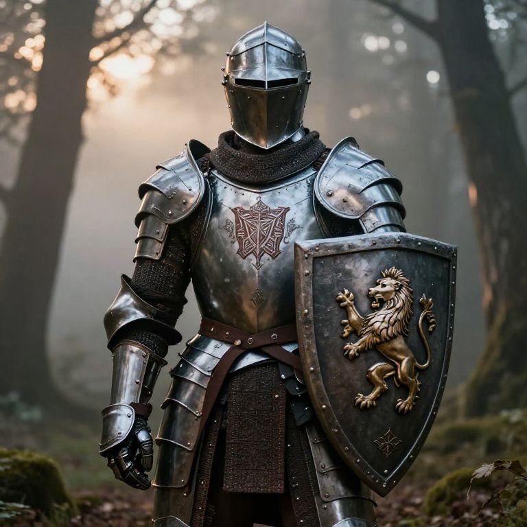 Paladin plate armor with ornate heraldic symbols, holding a large shield embossed with a lion emblem, misty forest background at dawn, cinematic atmosphere, rich in detail