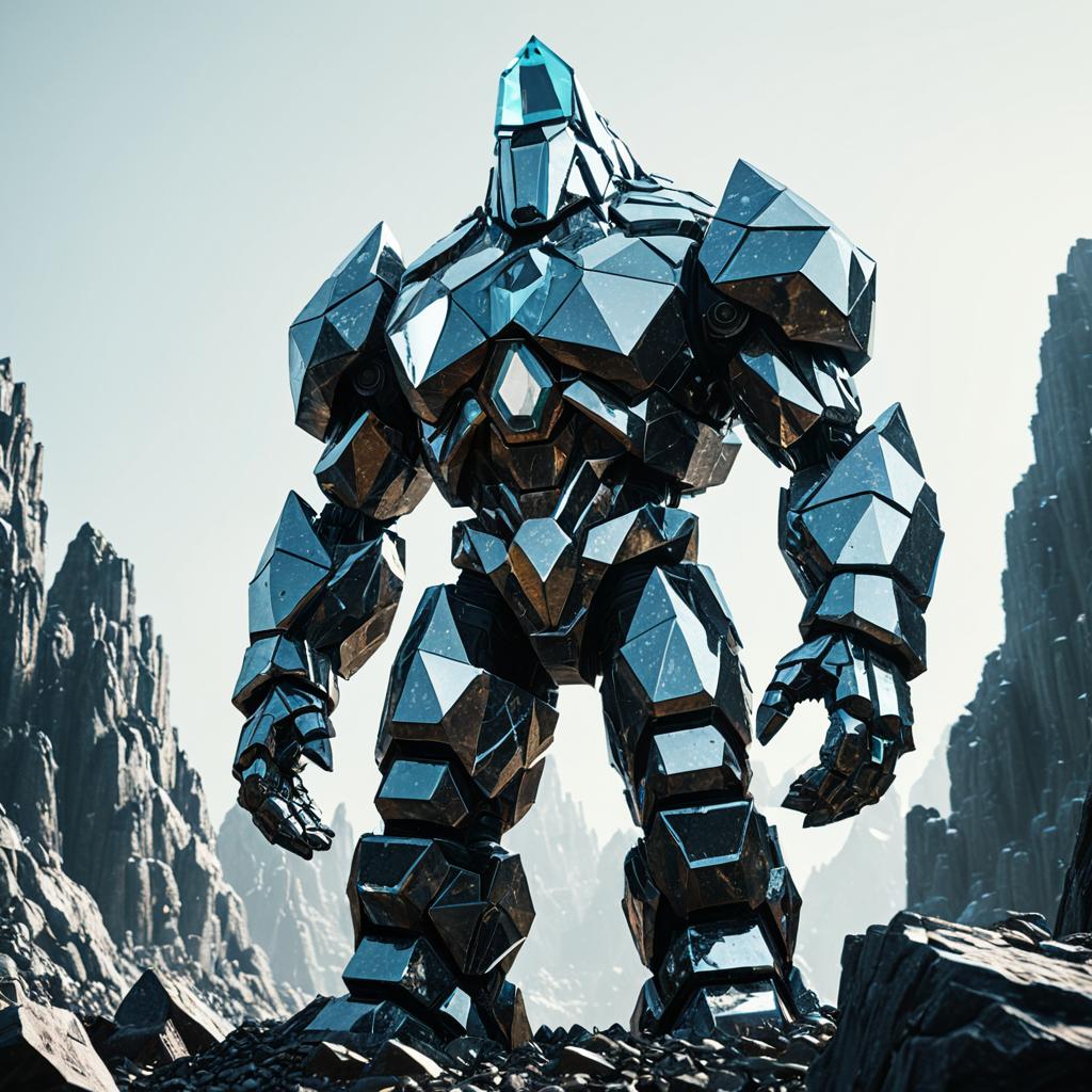 Hyper-detailed, breathtaking octane render of a towering crystal golem standing in a jagged rocky landscape. The golem is composed of large, dark, reflective crystal-like geometric shapes, creating a magnificent and dreamlike robotic figure.