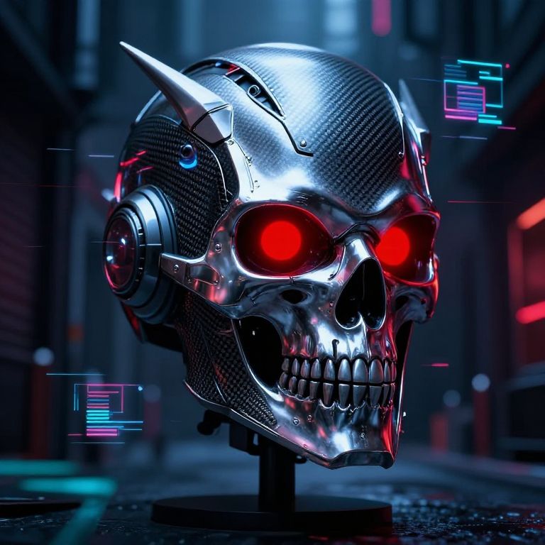 Futuristic skull helmet with sharp edges and glowing red eyes, detailed with chrome and carbon fiber textures, surrounded by digital glitch effects and neon holograms in a dark futuristic alley.