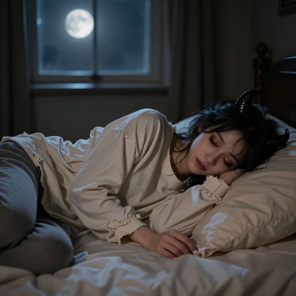 Masterpiece, (11:300 pm) overcast, dark, dim moonlight from the window, Rembrandt lighting, photorealistic, sharp focus, across the bed, pov, 1girl, 26-year-old succubus, (cute: 1.5) (petite: 1.3), black hair, (messy ponytail: 1.3), (small, subtle horns: 1.8), (tiny body: 1.5) (160cm height: 1.5) (small breasts: 1.5) With Thick Eyelashes, small mouth, (realistic skin texture: 1.3), dark hazel eyes (glowing faintly in the dark), (extremely delicate: 1.3), in bed, in silhouette, lying (on her side: 1.9) with her (head on the pillow), wearing an (old, frayed, large, oversized, boxy, long-sleeve crew-neck (cream-colored) shirt) and (grey sweat pants) (gentle, tired, loving smile)