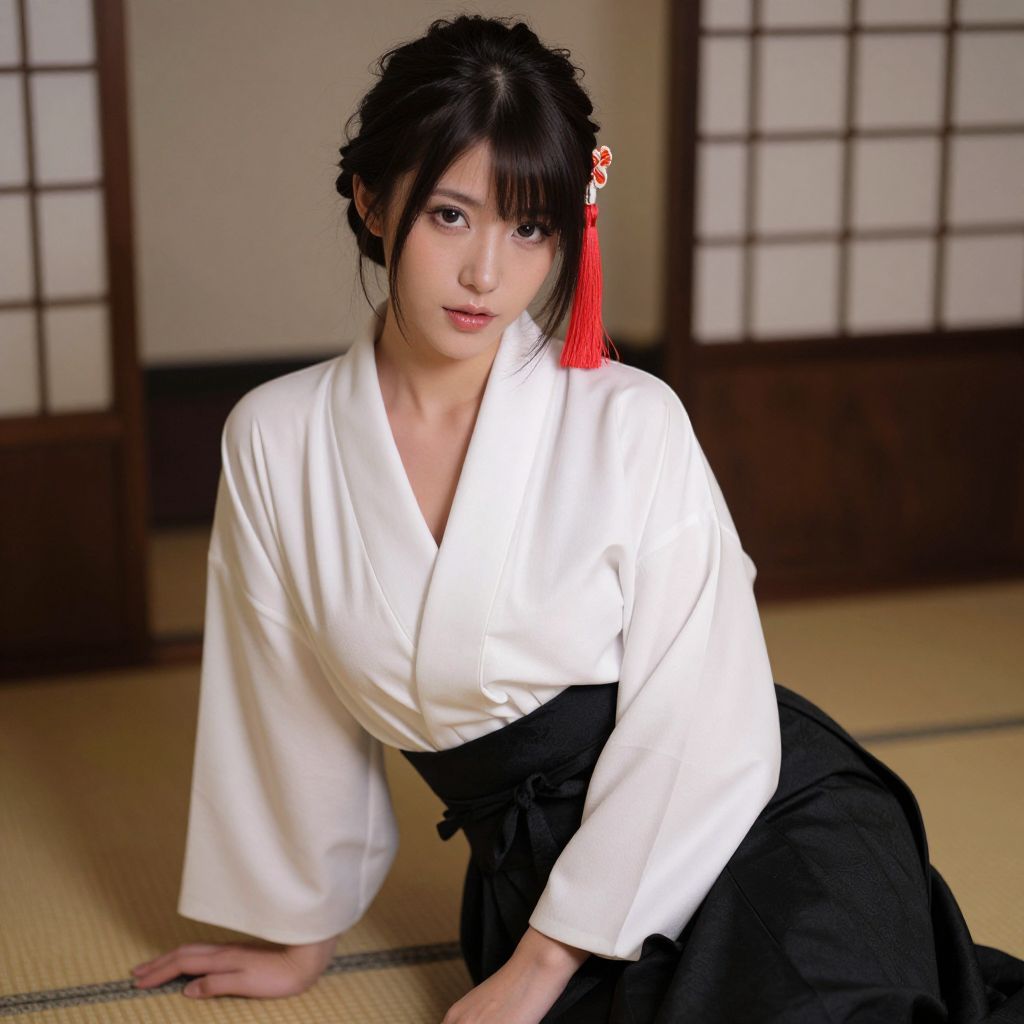 A beautiful woman with a captivating presence, wearing a traditional kimono with a white shirt and a black skirt. She has a red tassel in her hair, adding a touch of elegance and allure. The scene is set in a serene, elegant environment, highlighting her charm and style. She is exuding a confident and sexy aura, with a captivating gaze that draws the viewer in. The overall atmosphere is sophisticated and timeless, emphasizing her grace and poise.
