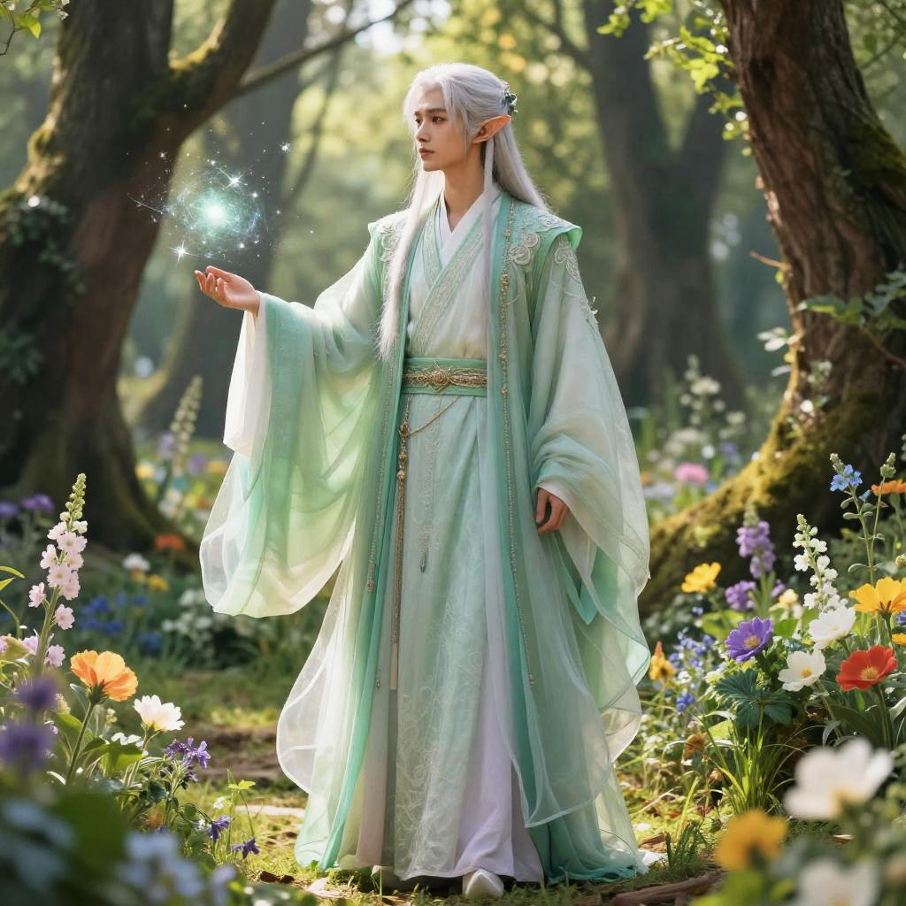 Spring eladrin male in a bright glade, hair shimmering like fresh leaves, clothed in light armor decorated with blooming flowers, with magical runes floating around him, radiant and lively.