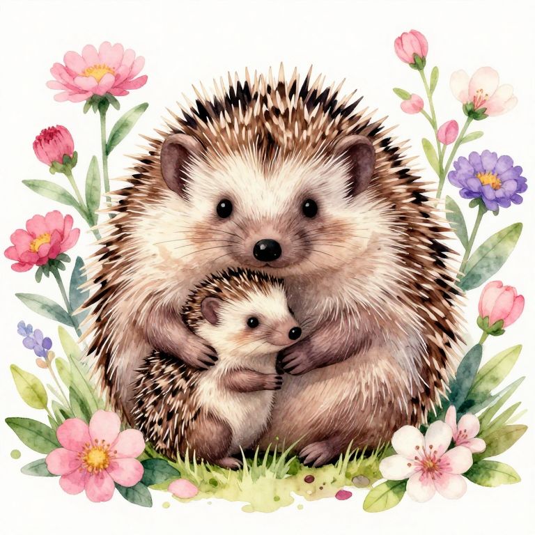 The image is a beautifully crafted watercolor painting featuring an adorable scene of a mother hedgehog and her baby. The mother hedgehog, with her soft, brown and white fur, is hugging her baby tightly, creating a heartwarming moment. The baby hedgehog, smaller in size, is nestled close to the mother, adding to the sense of warmth and protection. They are surrounded by a variety of spring flowers, including vibrant pink and purple asters, delicate pink and white blossoms, and lush green leaves, all rendered with soft, pastel colors that enhance the gentle and serene atmosphere. The flowers are scattered around the hedgehogs, with some in the foreground and others in the background, creating a sense of depth and natural beauty. The overall composition is harmonious, with the hedgehogs and flowers arranged in a balanced manner, drawing the viewer's eye across the scene. The soft, smooth textures of the watercolor technique add to the overall gentle and peaceful feel of the painting.