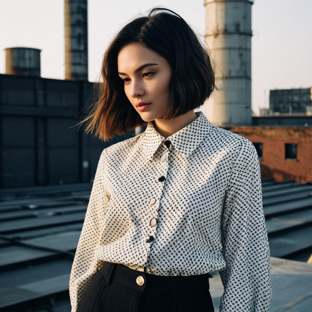 Angled Bob hairstyle on fashion model, wearing modern blouse, in industrial rooftop, captured in fashion editorial style with dramatic backlight.