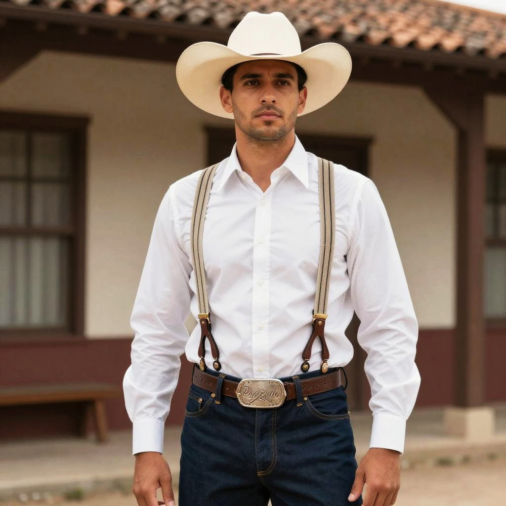 Western Formals Costume, man in a cowboy hat and suspenders standing in front of a building