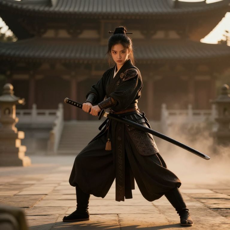 Dark Asian girl in traditional warrior attire, holding a katana, standing in an ancient temple courtyard, mist rising from stone floor, powerful and poised stance, warm golden hour lighting, exquisite textures and intricate details