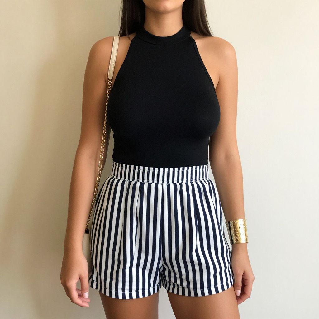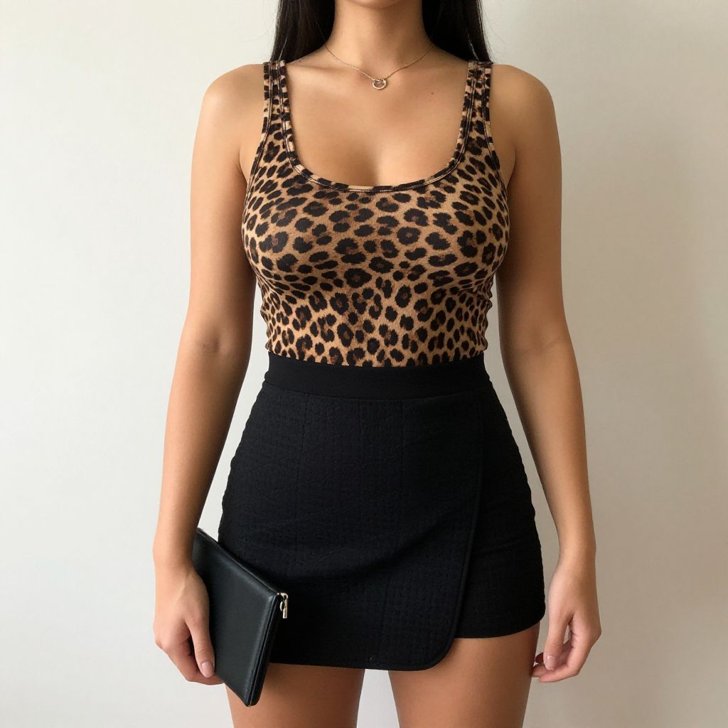 "Woman, casual, sleeveless heather gray top, crew neck, black faux leather mini skirt with asymmetrical wrap design, textured clutch with chain strap.. Sexy. Pretty face and beаutiful eyes. Big breasts."