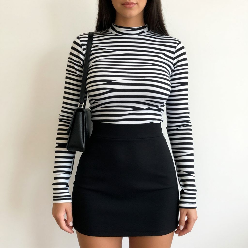 Photograph of a woman in a sleeveless white top and black leather mini-skirt, holding a black chain-strap purse, white background.