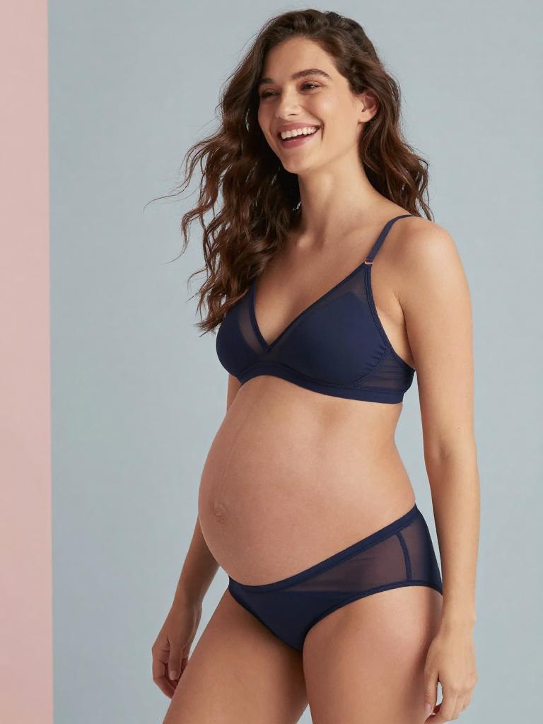 Pregnant fashion outfit, image in the style of soft natural light boudoir photography of joyful expecting woman laughing softly with long loose curls flowing over her shoulders and pear-shaped maternity silhouette with accentuated hips, lingerie mesh set, wearing navy mesh longline bra with coordinating lightly lined briefs, standing in powder blue minimal studio backdrop studio background, tasteful high-end maternity lingerie fashion photography, soft flattering lighting, subtle skin retouching, high resolution, ultra-detailed