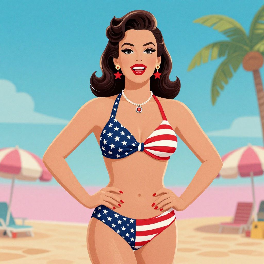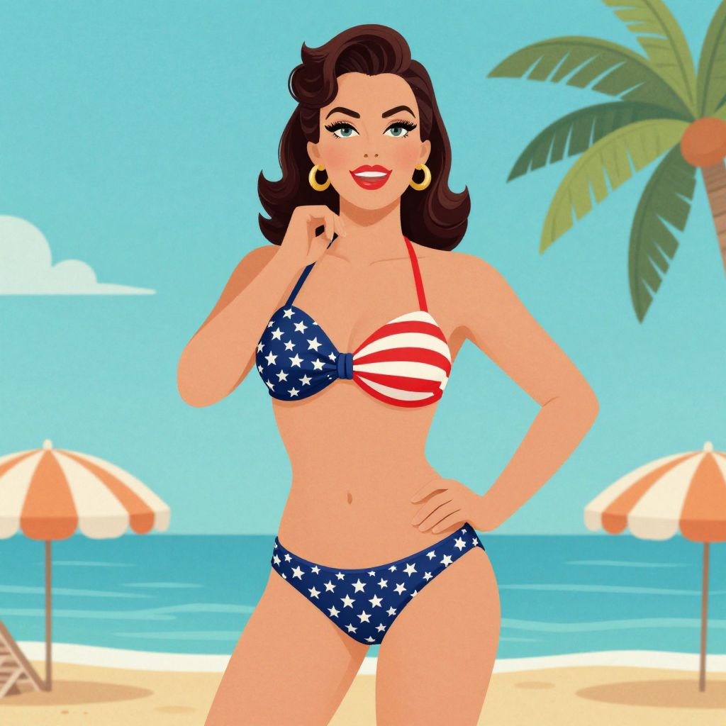 Digital illustration of a smiling woman with dark hair in an American flag bikini, red earrings, pearl necklace, and red nails, standing on a sunny beach