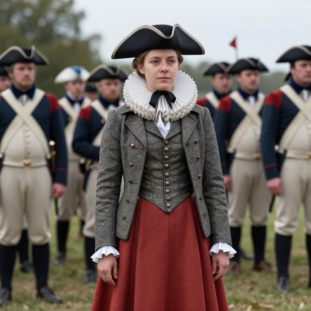 Historically attired woman stands prominently in the foreground, wearing a detailed Revolutionary War-era ensemble featuring a tricorn hat, layered ruffled collar, and a fitted vest over a red skirt, surrounded by similarly dressed soldiers in the background.