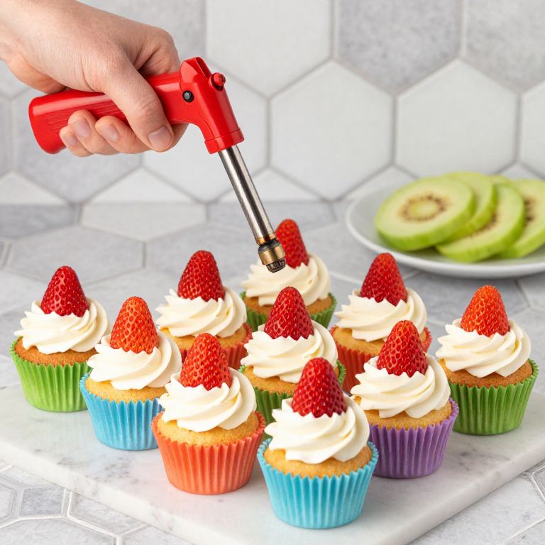 A photograph of a hand holding a red cupcake corer, piercing a strawberry-topped cupcake with white swirled frosting. The cupcakes are in colorful wrappers: blue, green, purple, and orange. They are arranged on a white marble surface. In the background, a plate with sliced green apples rests on a white, hexagonal-tiled wall. The image is brightly lit, emphasizing the vibrant colors and textures of the cupcakes and fruit. The hand is light-skinned and the corer is metallic with a red grip.
