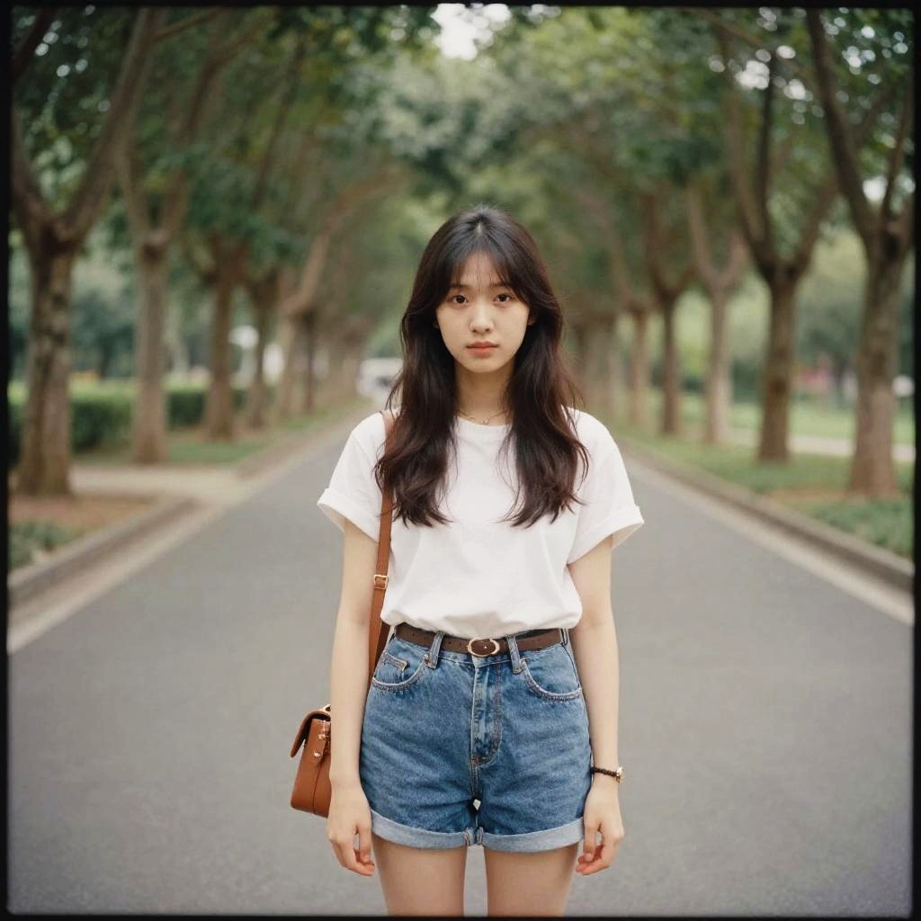 Photograph of an East Asian woman with long black hair standing on a tree-lined street. She wears a plain white short-sleeve shirt, high-waisted blue denim shorts, and a brown leather shoulder bag. Her expression is neutral, and she looks directly at the camera. The background features a blurred, symmetrical row of trees on either side of the asphalt road, with greenery visible beyond. The image has a slight vintage filter, enhancing the colors and adding a soft, nostalgic feel. She stands in the center of the frame, with the road extending into the distance.
