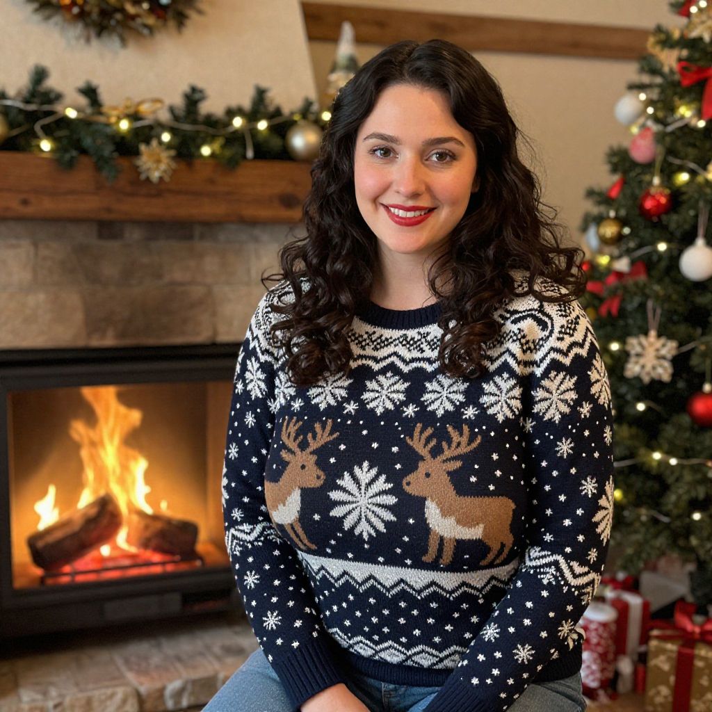 A candid, realistic photo of a woman with long dark curls and a warm, smiling face wearing a handmade Christmas jumper featuring snowflakes and reindeer, sitting by a crackling fireplace in a cozy cottage decorated with garlands and ornaments.. The woman has big tits and cute face