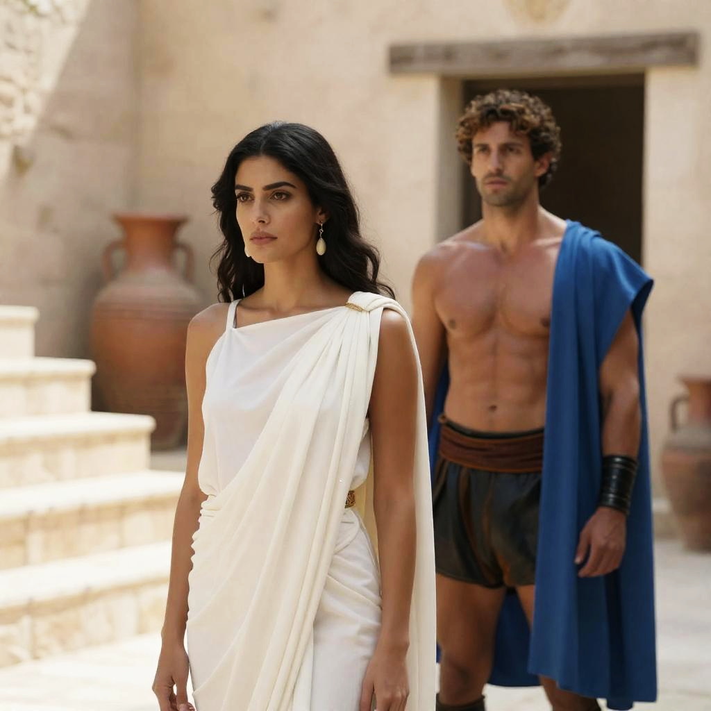Photograph of two people in a rustic, stone-walled courtyard. Front woman with long black hair, white toga, and earrings, looking to the side. Rear man with muscular build, blue cape, black arm bands, and leather pants, looking forward. Sunlight illuminates the scene. Background includes stone steps, large vases, and an open doorway.