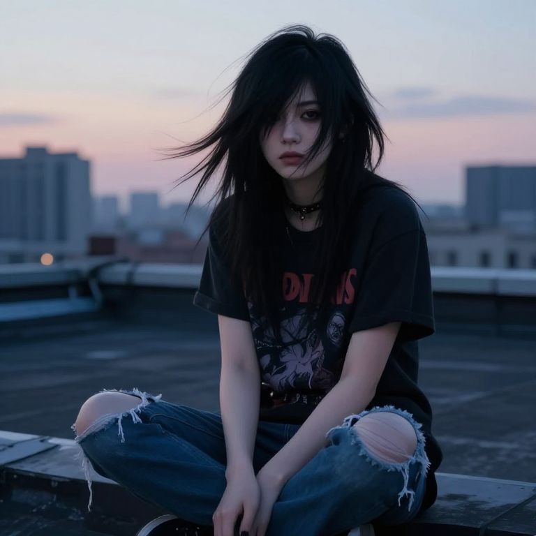 Black hair emo girl sitting on a rooftop during twilight, wind blowing strands of hair across her face, dressed in ripped jeans and a vintage band t-shirt, city skyline behind her, with a soft yet somber mood, realistic painting style.