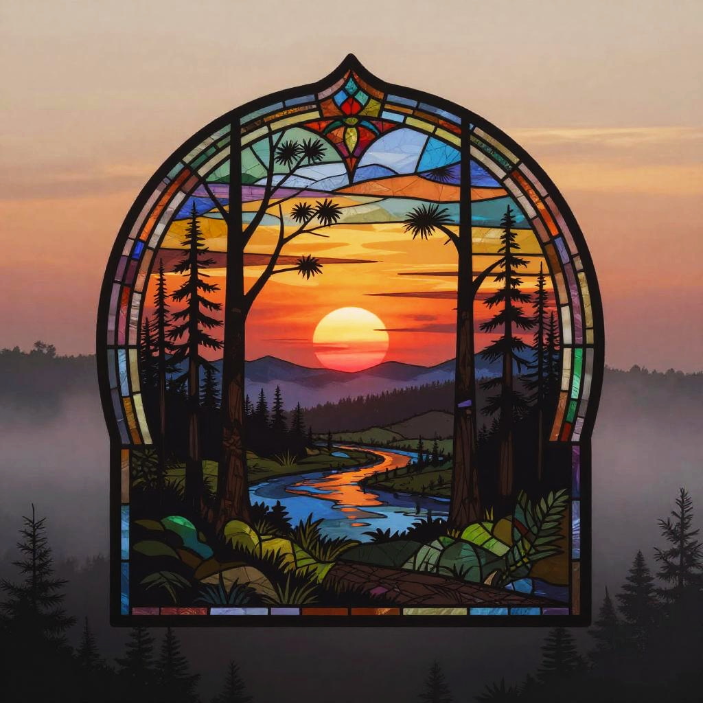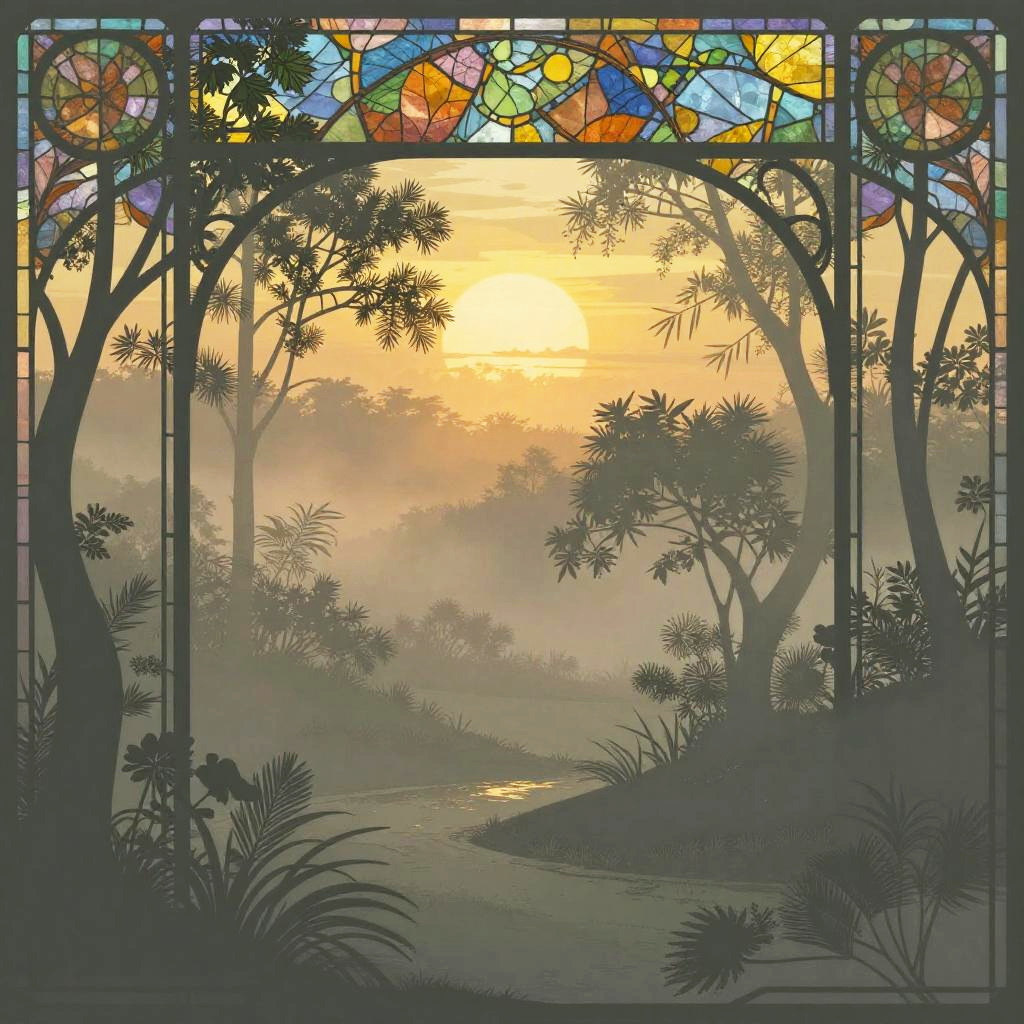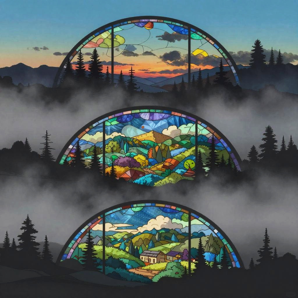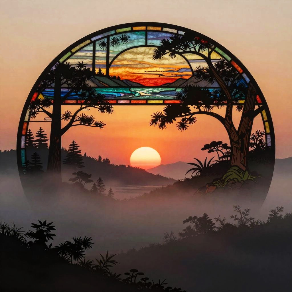 Multiple layers of silhouette in vector style, sharp edges, twilight background with dense fog, detailed silhouette cityscape wallpaper inspired by Studio Pierrot, stained glass effect, dramatic lighting, intricate details, deep colors, misty atmosphere