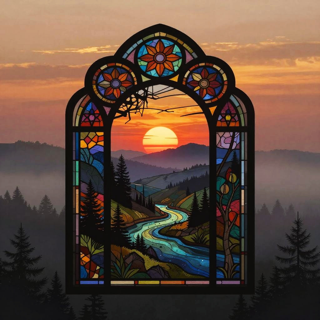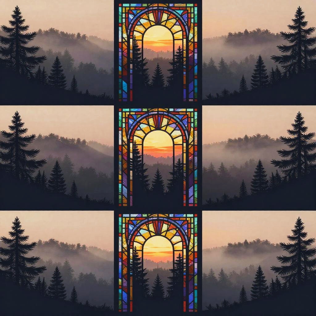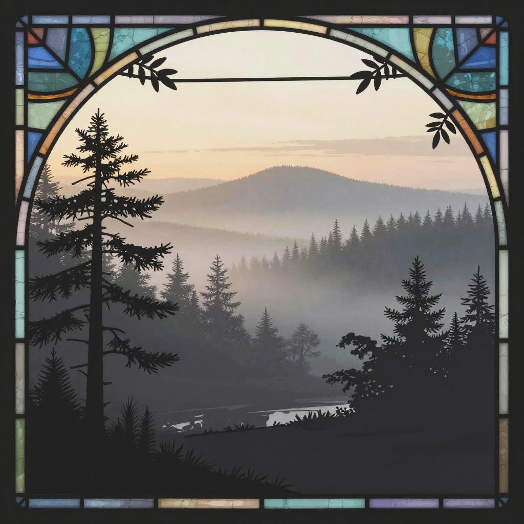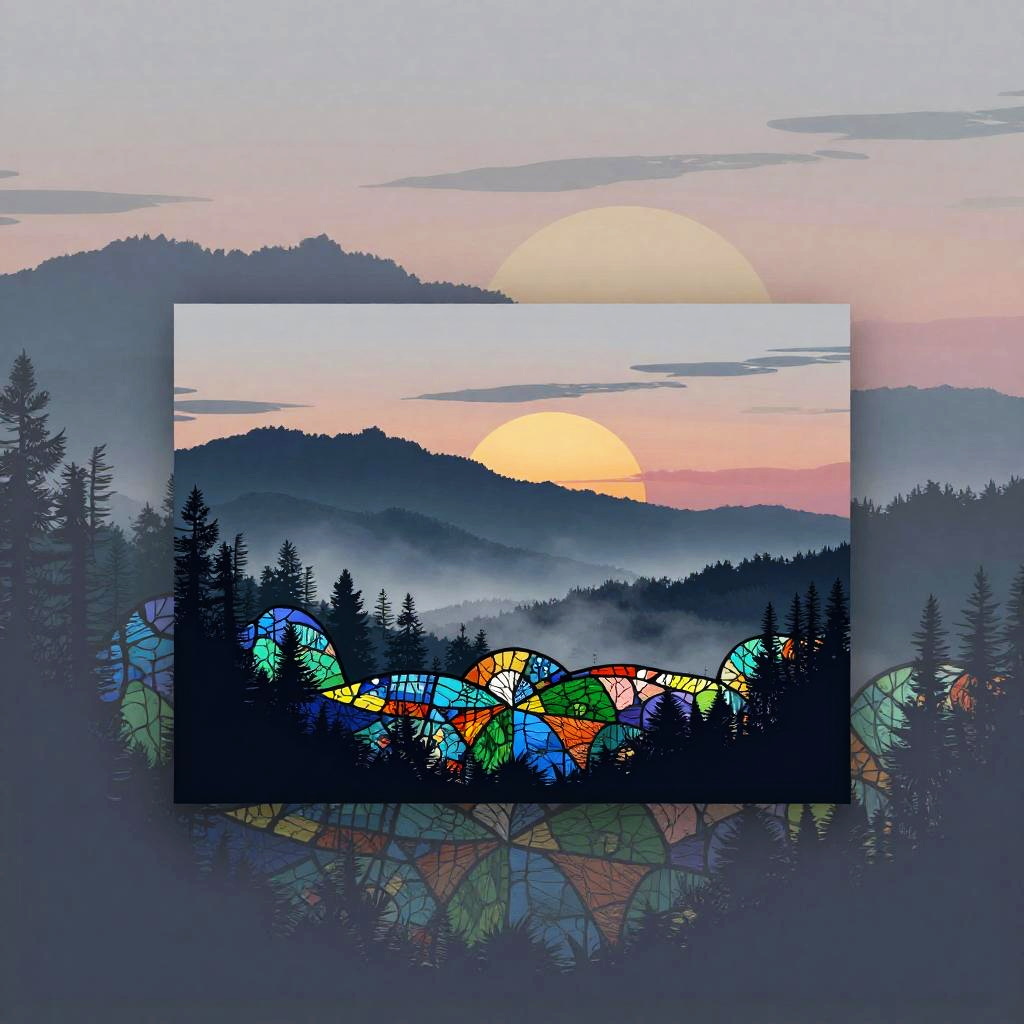 Multiple layers of silhouette in vector style, sharp edges, twilight background with dense fog, detailed silhouette cityscape wallpaper inspired by Studio Pierrot, stained glass effect, dramatic lighting, intricate details, deep colors, misty atmosphere
