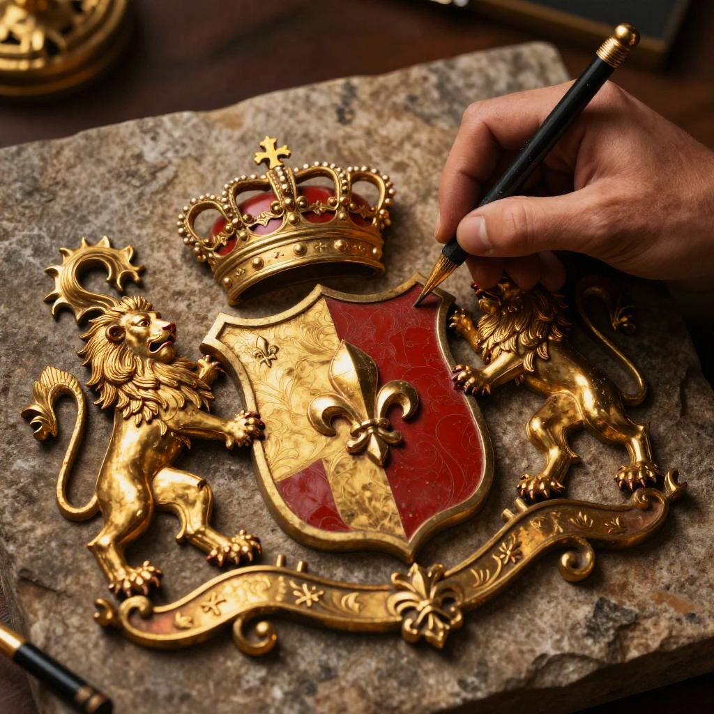 Crest creator crafting a royal emblem featuring classic symbols like lions, crowns, and fleur-de-lis, textured stone and enamel materials, warm golden and crimson hues, ornate filigree patterns surrounding the shield, dramatic lighting that emphasizes depth and grandeur.