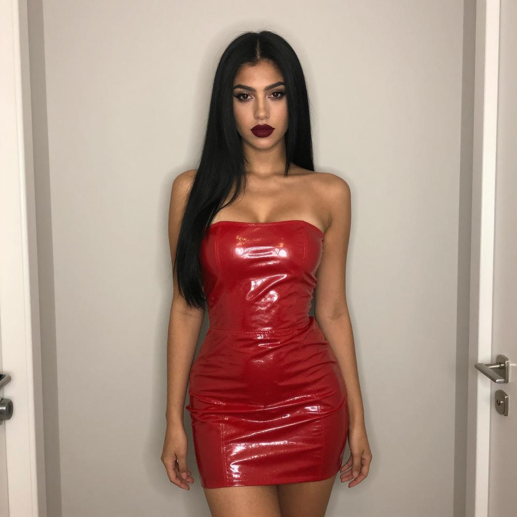 Woman with long black hair takes a mirror selfie in a bathroom. She wears a white bodycon dress and a black leather jacket. Her right hand holds a black phone with a pop socket. Her left hand touches her neck. The background includes a white door and a light switch. Her facial expression is slightly pouty. She has light brown skin and full lips. She stands in front of a mirror, capturing her upper body and face. She is the only person in the image.