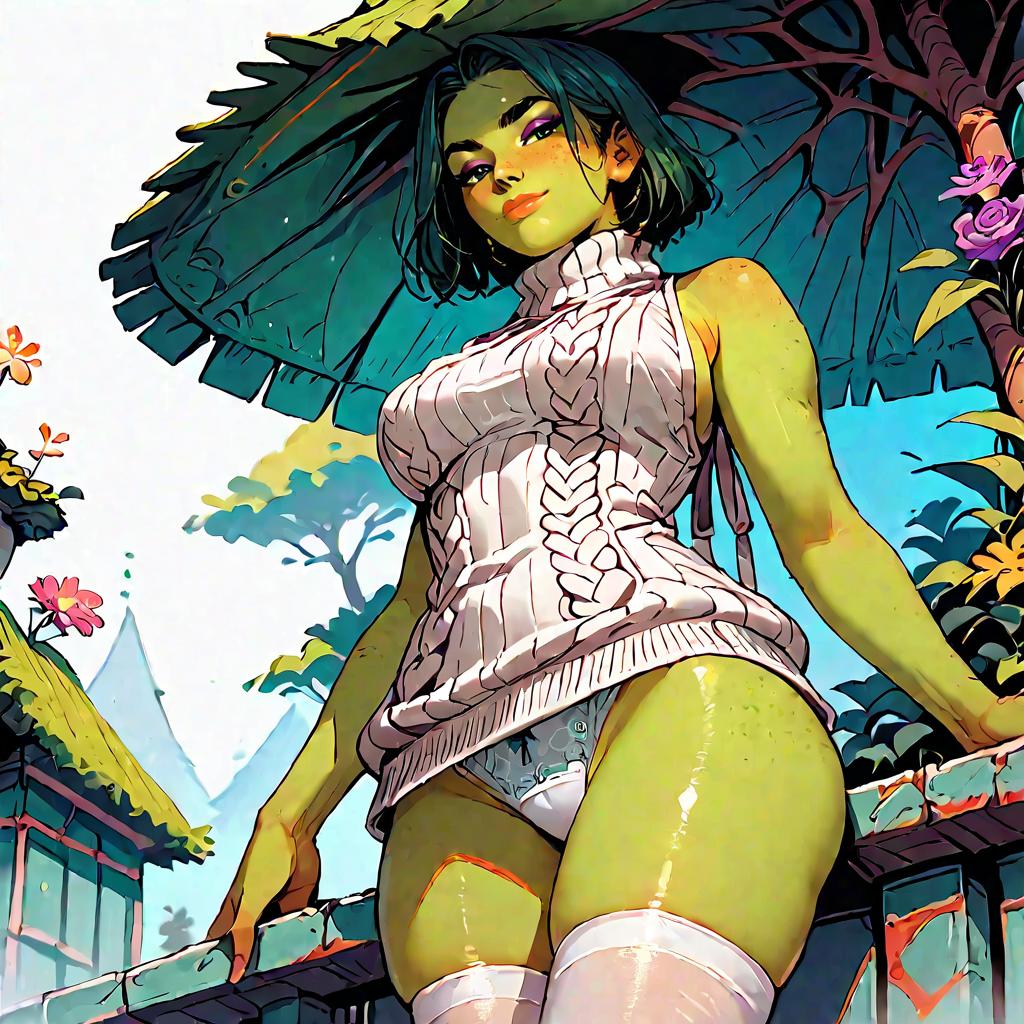 Score_9, score_8_up, source_anime, shrek, green skin, virgin destroyer sweater, white panties, white thighhighs, smirk