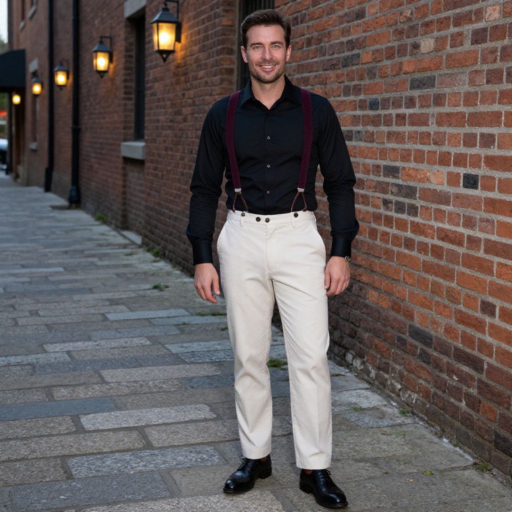 A man, crisp black dress shirt, burgundy velvet suspenders, tailored cream chinos, brogue shoes, subtle cufflinks, brick facade, weathered stone pathways, flickering lanterns at dusk, candid shot, confident smile. Man has masculine face and piercing eyes
