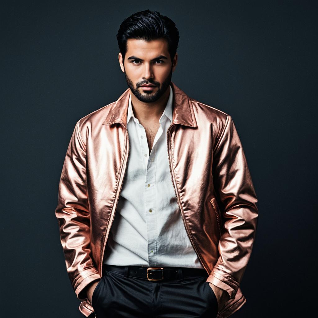 Rose gold man clothes ,1boy, male focus, solo, realistic, facial hair, jacket, shirt, looking at viewer, pants, black hair, open clothes