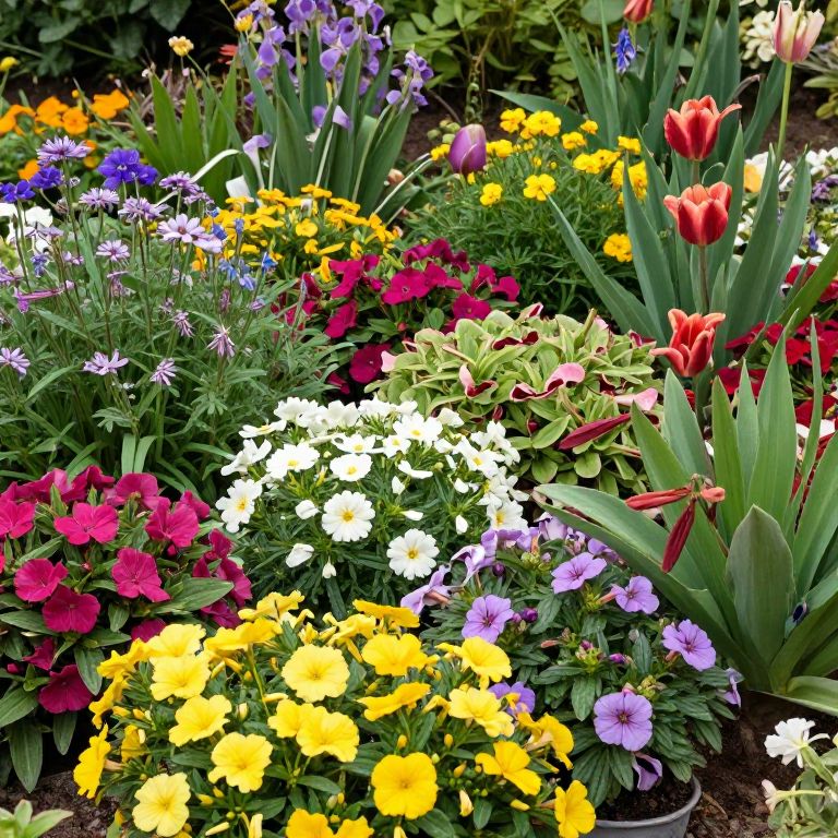 Colorful garden with a variety of blooming plants and flowers, vibrant blossoms in full bloom, soft natural lighting, realistic photography style
