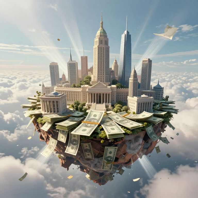 A surreal scene of kapital as a floating island of money and assets, surrounded by clouds and beams of light, ancient architecture fused with modern skyscrapers, detailed fantasy art, bright and inspiring atmosphere