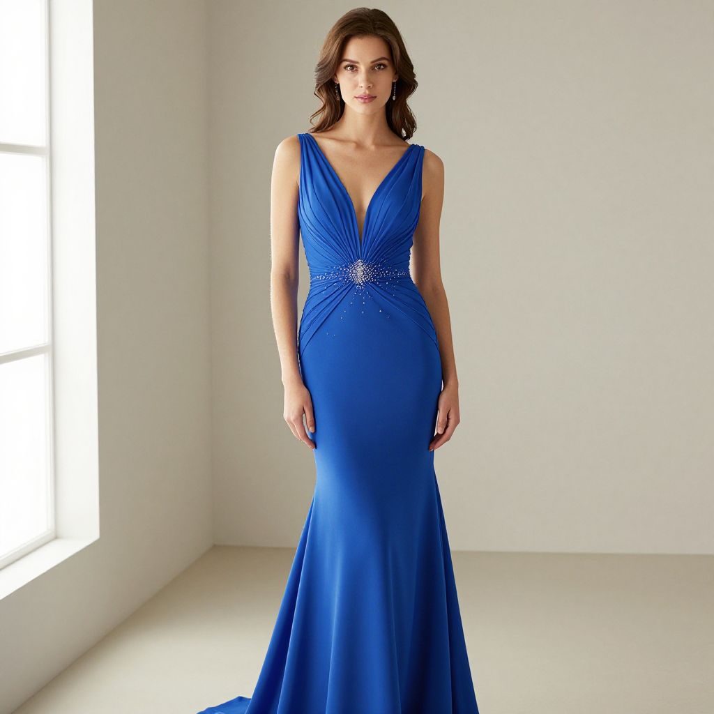 Elegant woman wearing a vibrant royal blue mermaid-style wedding gown with a deep V-neckline and delicate embellishments at the waist, gracefully posed against a minimalist backdrop with soft natural light streaming through a window to her left.