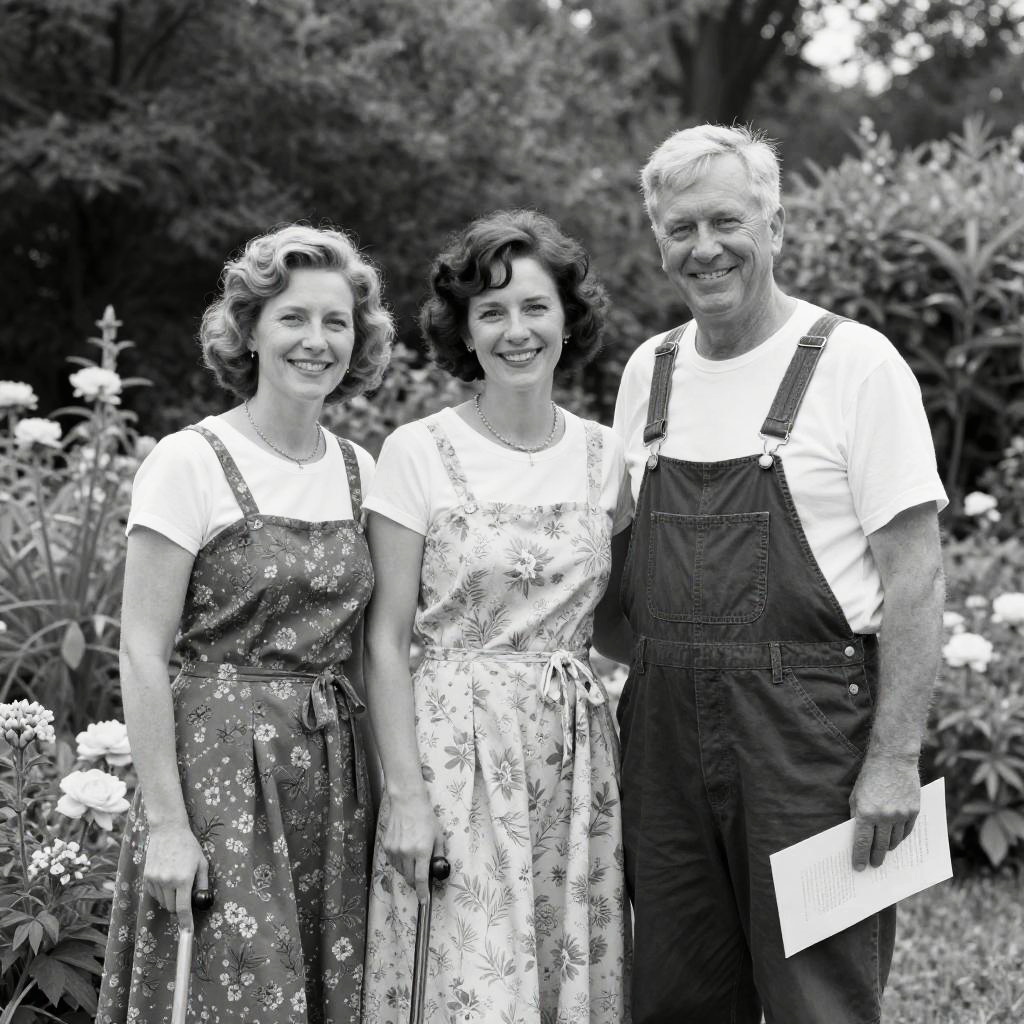 Black-and-white photo of three smiling people standing in a garden. Two women with short, wavy hair wear floral dresses over white shirts, and a man with short, gray hair wears a white shirt and dark overalls. The man holds a paper, and the women each hold a cane. Lush greenery and blooming flowers fill the background. They stand close together, exuding a friendly, nostalgic vibe.
