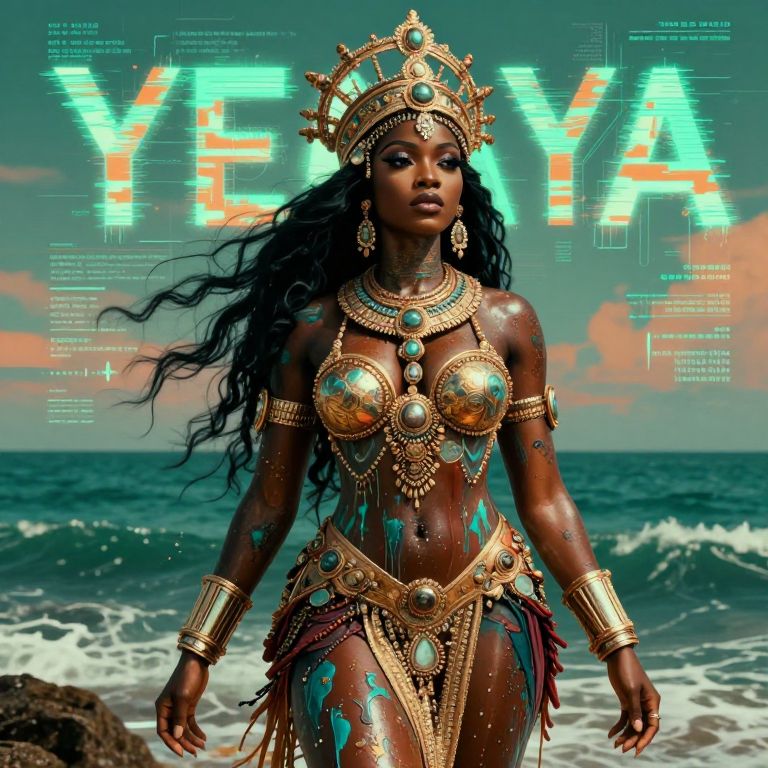 The image depicts a striking representation of Yemaya, the Yoruba goddess of the sea, in a cyberpunk setting. The figure is adorned with intricate, metallic accessories and a crown, exuding a sense of regality and power. The background features a damaged, glitchy interface with digital letters and numbers, adding to the cyberpunk aesthetic. The ocean in the background, with its greens and oranges, contrasts with the metallic textures and the goddess's ornate attire. The overall composition is dynamic, with the goddess positioned centrally, her figure dripping with paint, and the background elements creating a sense of depth and complexity. The image is rich in detail, with a blend of natural and technological elements, creating a visually captivating scene.