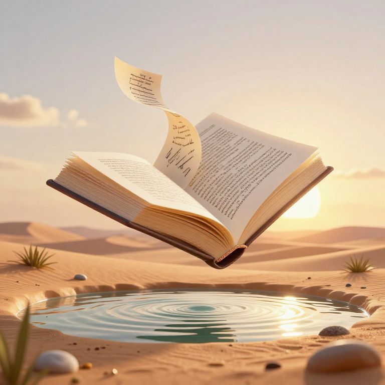Photograph of an open, floating book with pages fluttering above a serene desert oasis, reflecting sunset light on rippling water.