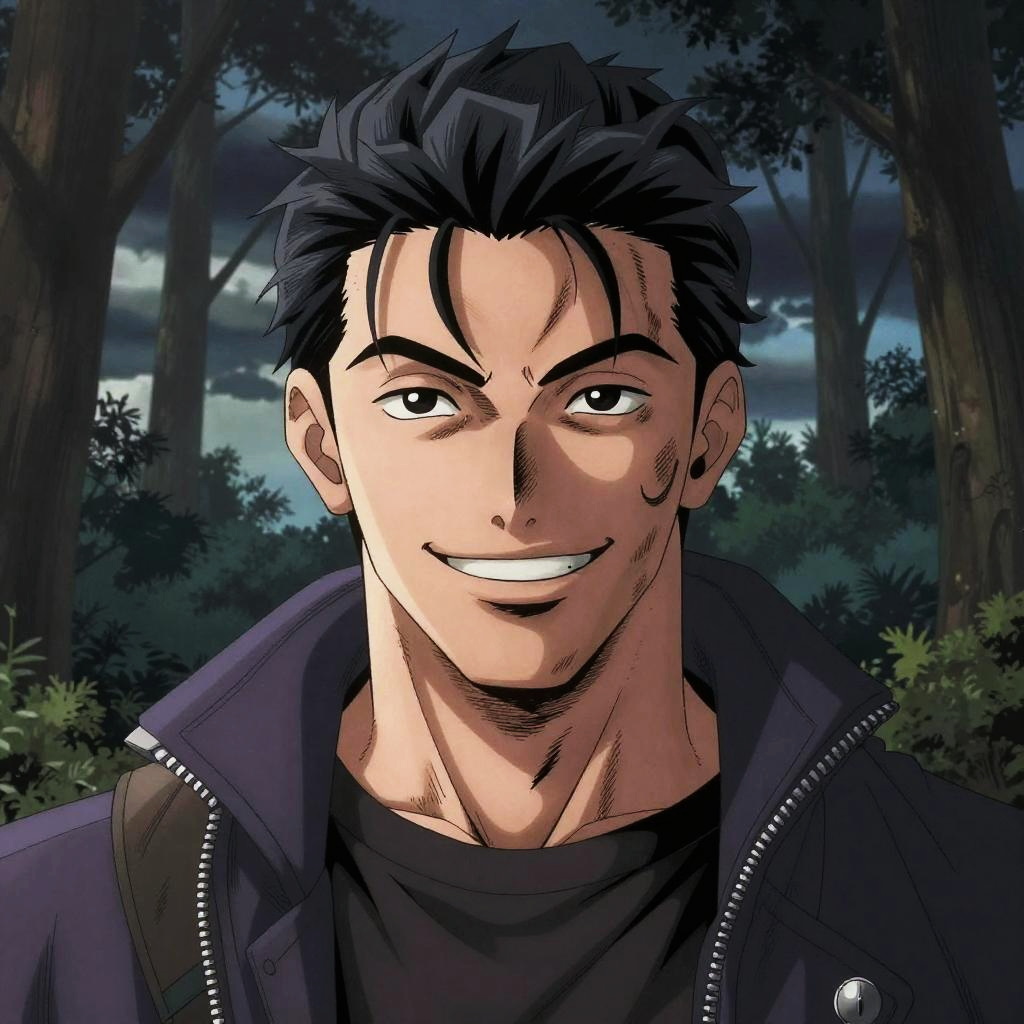 Comic artwork of phantom thief, portrait, smiling, happy, forest background, stormy twilight shadows, crosshatching, 2D, Sharp, Detailed, HD, HDR, High Quality, High Resolution, Masterpiece