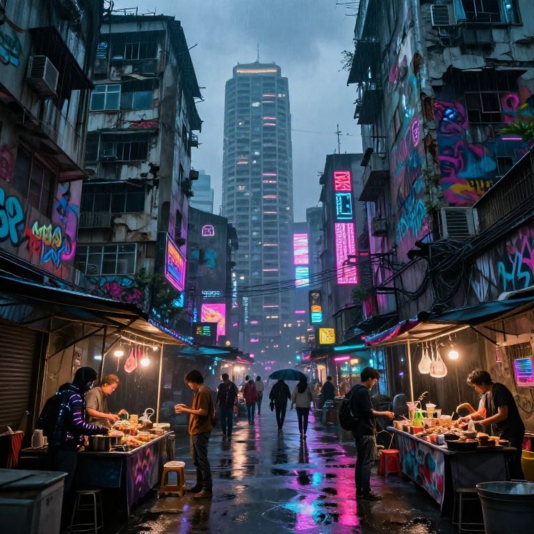 Cyberpunk slums sprawling under neon-lit skies, dilapidated high-rise buildings covered in graffiti, bustling with diverse street vendors and tech modifications, rain-soaked alleys reflecting colorful holograms, gritty yet vibrant atmosphere.