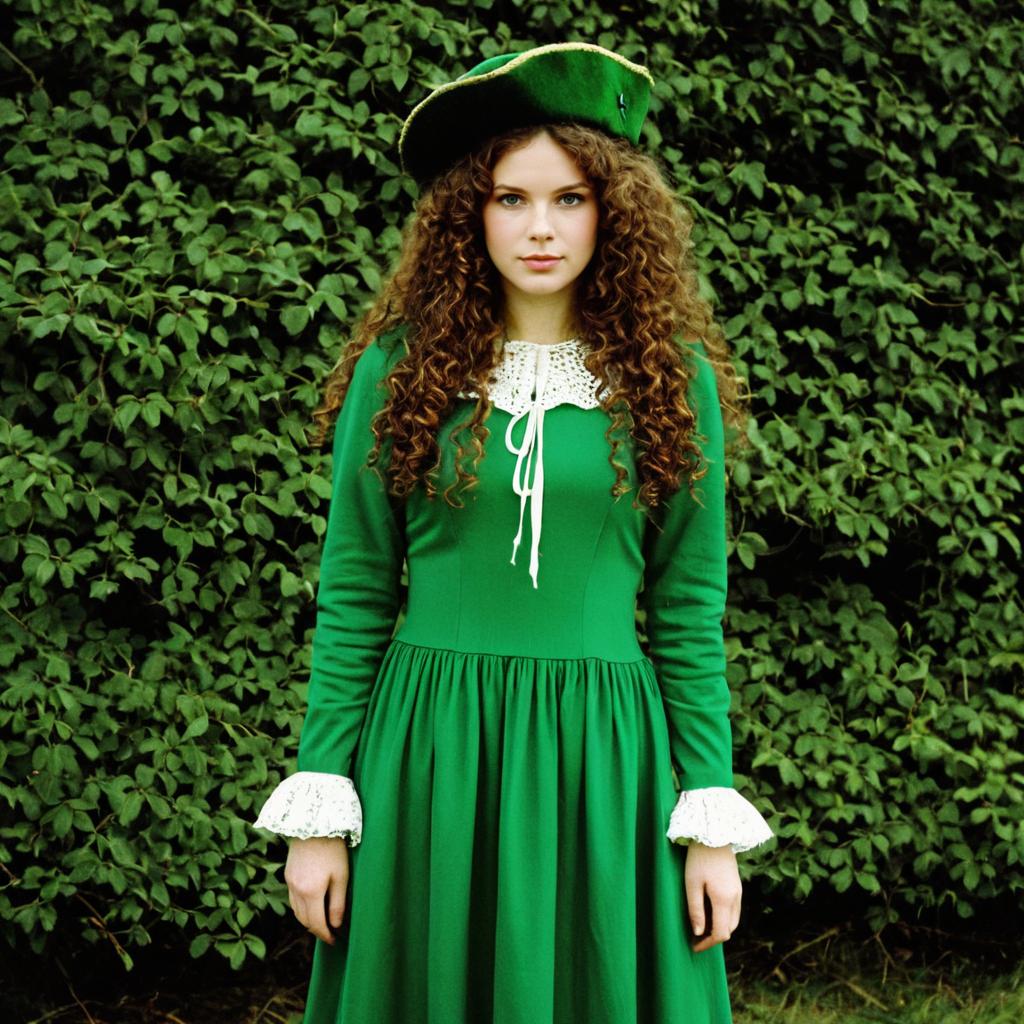 Woman irish fancy dress,1girl, solo, dress, green dress, brown hair, long hair, green headwear, long sleeves, hat, curly hair, standing, looking at viewer
