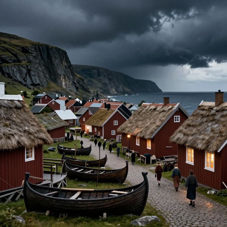 In the year 1630, a danish medieval fishing village nestles below the dark, looming cliffs, anticipating an approaching storm from the ocean. Viking longboats, their hulls weathered and sturdy, line the shore, ready for the tempest. The village is a bustling hub of activity, with villagers in period attire walking between thatch-roofed buildings, their wooden structures weathered by time and the elements. The scene is peaceful yet dark, with the glow of lanterns illuminating the narrow cobblestone streets and the warm light from the windows of the buildings. The overall composition is rich in detail, with the interplay of colors, textures, and shapes creating a vivid and immersive depiction of life in a medieval fishing village.