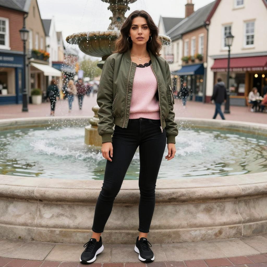 A toned woman in casual streetwear, featuring an olive green bomber jacket with ribbed cuffs, black skinny jeans, and a light pink knit sweater with a scoop neckline and black lace trim, paired with black sneakers. She stands confidently at a town plaza fountain, embodying the vibrant visual style of One Peace Books. Sexy. Pretty face and beutiful eyes
