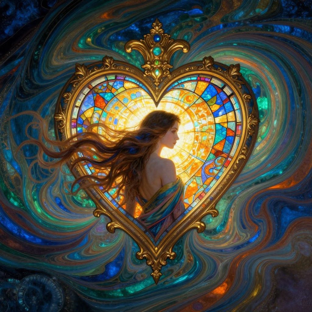The image presents a surreal and intricate scene, dominated by swirling, vibrant colors that create a sense of depth and movement. At the center, a woman with long, flowing hair is depicted, her face turned away from the viewer, adding an air of mystery. She is encased within a heart-shaped frame, which is itself adorned with ornate, golden embellishments, suggesting a sense of importance or reverence. Within the heart, a stained-glass window reveals a radiant, golden interior, filled with intricate patterns and light, symbolizing a source of enlightenment or divine light. The colors in the image are rich and varied, with shades of blue, green, and orange blending seamlessly, creating a dreamlike atmosphere. The overall composition is balanced, with the heart and the woman positioned centrally, drawing the viewer's eye to the heart's glowing interior. The interplay of colors and textures, combined with the symbolic elements, evokes a sense of spiritual or emotional depth, inviting the viewer to ponder the meaning behind the scene.