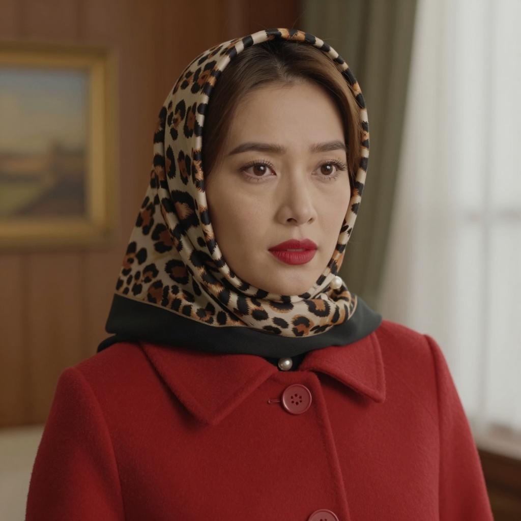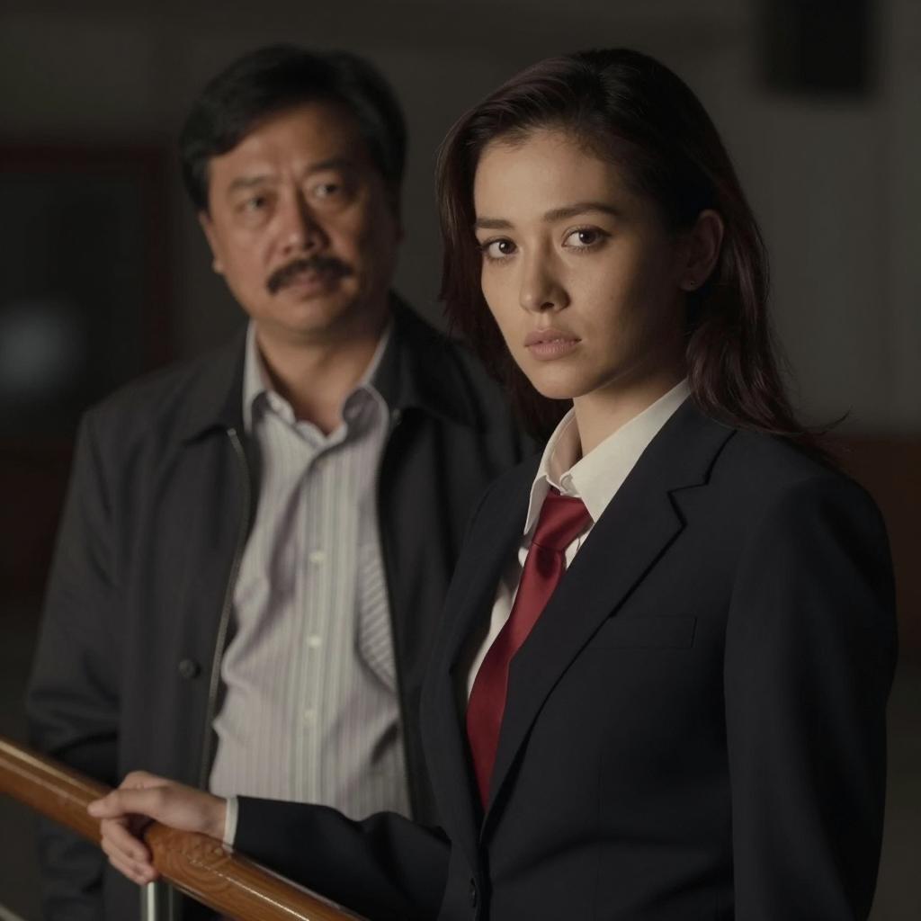Two people standing outdoors at night. Foreground: woman with dark hair, intense gaze, wearing a dark suit over a white shirt with a red tie. Background: man with dark hair and mustache, wearing a dark jacket over a striped shirt, slightly out of focus. Woman in the foreground holds onto a wooden railing with her right hand. Low light highlights woman's face, creating a shadowy background.