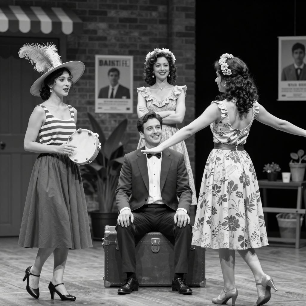Black and white photo of four people in a theatrical setting. Left: woman with large feathered hat, striped top, and skirt, holding a tambourine, walking. Center: man in dark suit, bow tie, seated on a trunk, smiling. Right: woman in floral dress, back turned, arms outstretched. Background: woman with curly hair, floral headpiece, and dress, standing, smiling. Brick wall, posters, and plants in the background.
