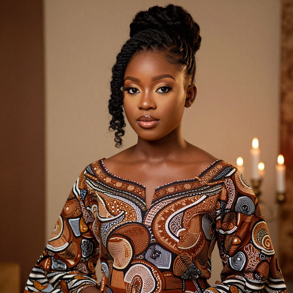 Black girl locks tightly coiled and styled in an elegant updo, wearing traditional African attire, rich earthy tones, detailed patterns on fabric, regal and graceful expression, indoor setting with warm candlelight, evoke cultural pride and heritage.