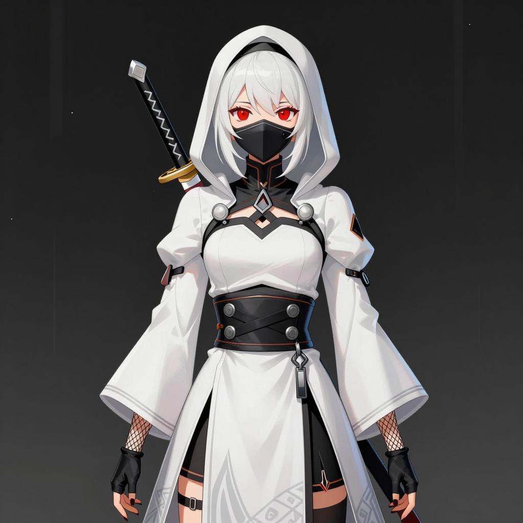 Digital illustration of an anime-style female character with white hair and red eyes. She wears a white hooded robe with black accents, fishnet gloves, and a black mask. Two swords are sheathed on her back. Her hands are gloved and positioned at her sides. The background is dark with vertical light patterns. She has a neutral expression.
