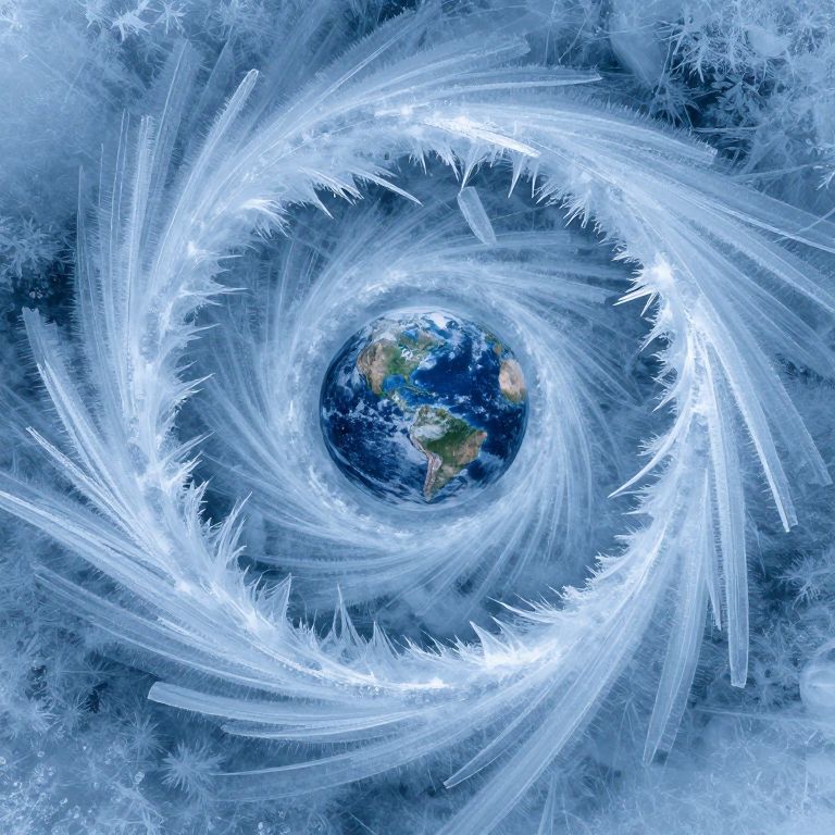 A digital artwork depicting a swirling vortex of white, icy, lightning-like tendrils encircling a vibrant Earth. The planet shows detailed continents with blue oceans, green landmasses, and brown mountains. The background is a deep blue with snowflake-like patterns, enhancing the cold, celestial theme. The vortex's energy and movement are emphasized by the glowing, ethereal white lines, creating a sense of dynamic motion. The overall style combines realistic planetary imagery with abstract, futuristic elements.