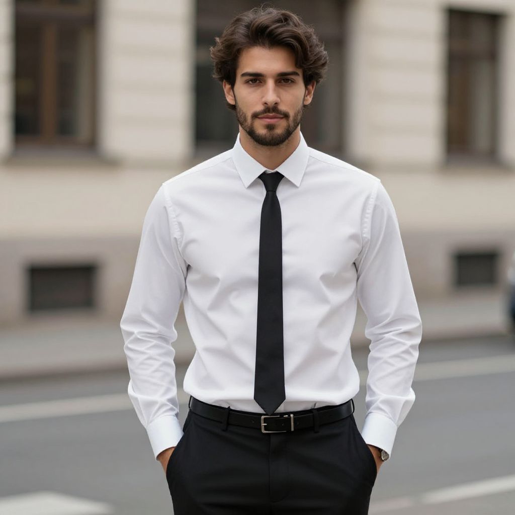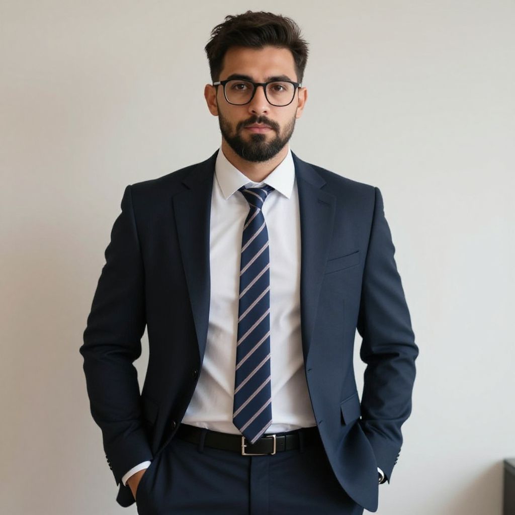 "office appropriate costume, 1boy, necktie, male focus, solo, glasses, suit, formal, facial hair, hands in pockets, shirt, beard, jacket, white shirt, looking at viewer, pants, collared shirt, striped necktie, standing, realistic Realistic photo of casual sexy person with pretty face"