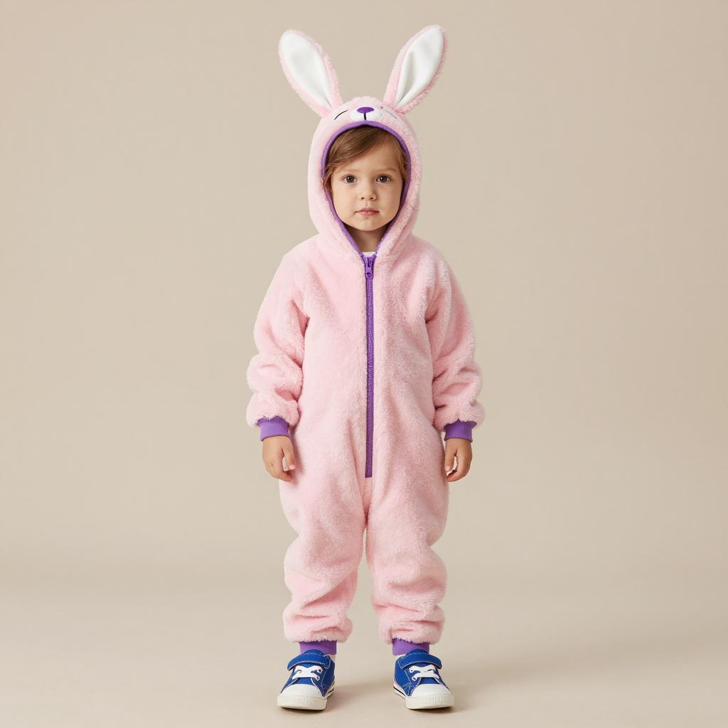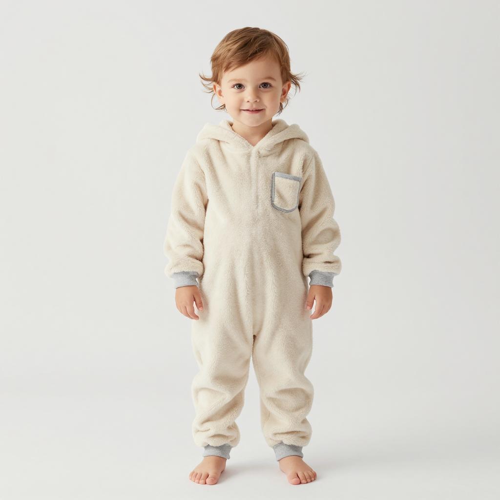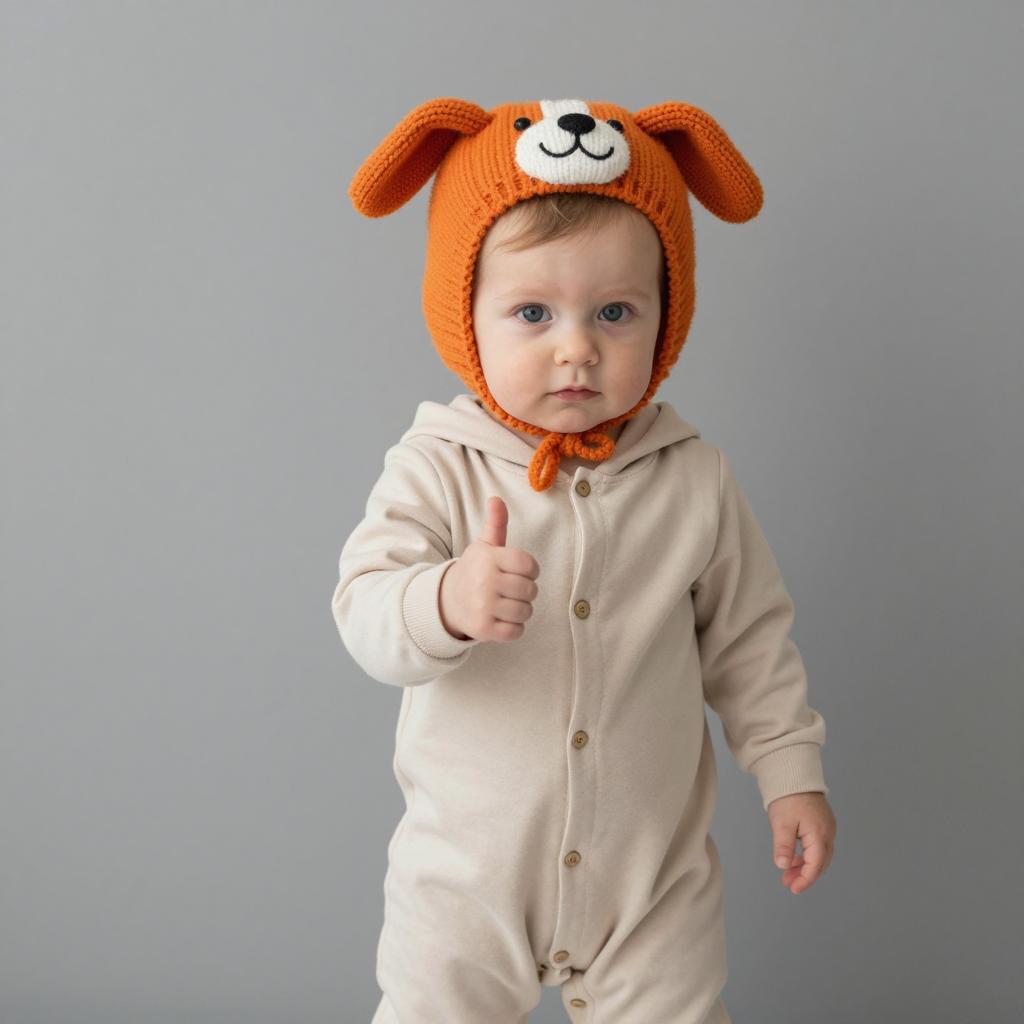 Toddler little costume, photograph of a young child standing, wearing an orange animal onesie with black buttons and a black pocket, brown pants, and brown shoes, cartoon bear ears on a white hood, light grey background, child facing camera, neutral expression, soft lighting, realistic style, full-body shot, standing pose