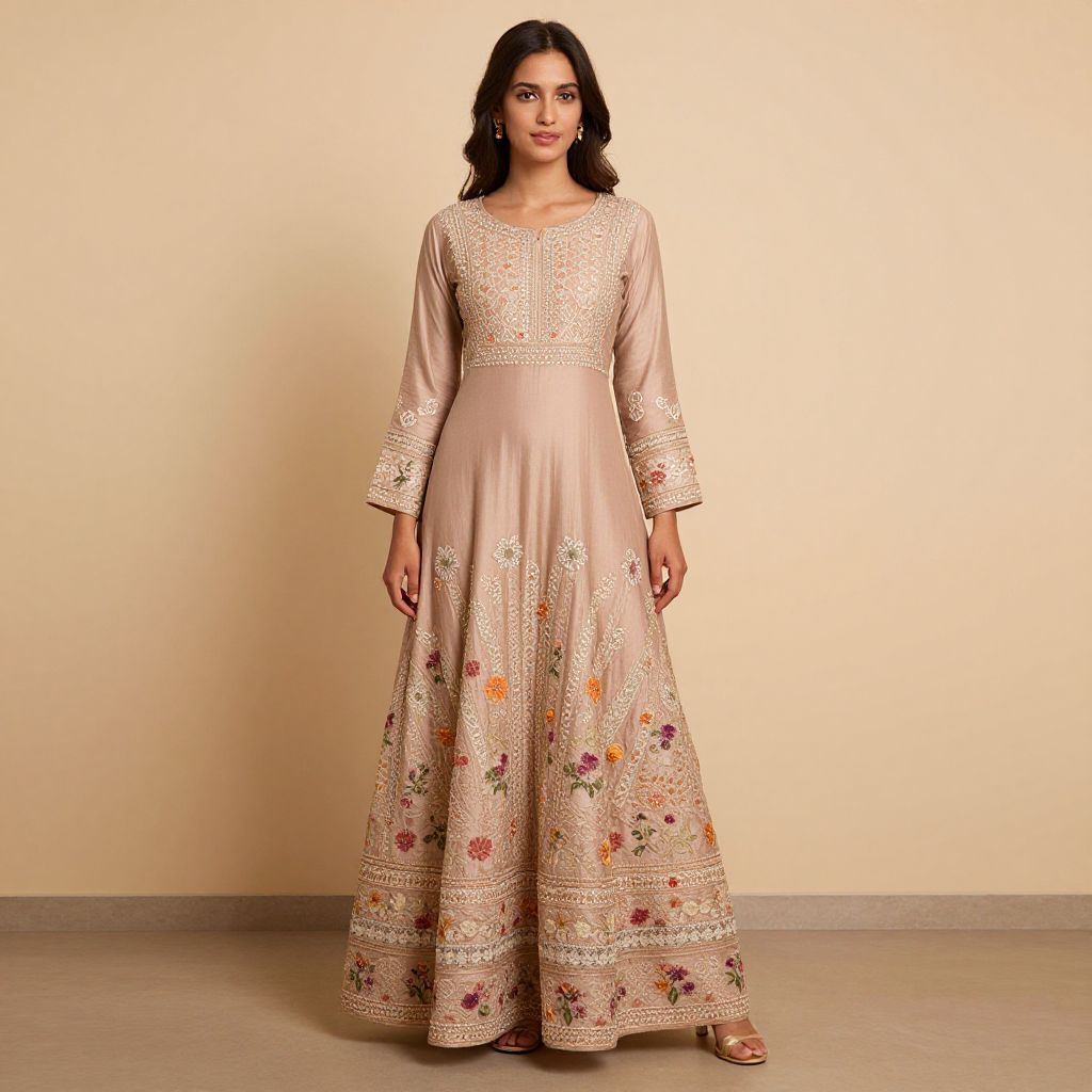 Photograph of a young woman with medium brown skin and black wavy hair, standing against a plain beige wall. She wears a long, pale pink, three-quarter-sleeved salwar kameez adorned with intricate white embroidery and colorful floral patterns on the lower half. The dress has a high neckline and a slightly fitted bodice, with the skirt flowing to the floor. She stands with a relaxed posture, hands by her sides, and gazes directly at the camera. The floor is a light gray concrete.