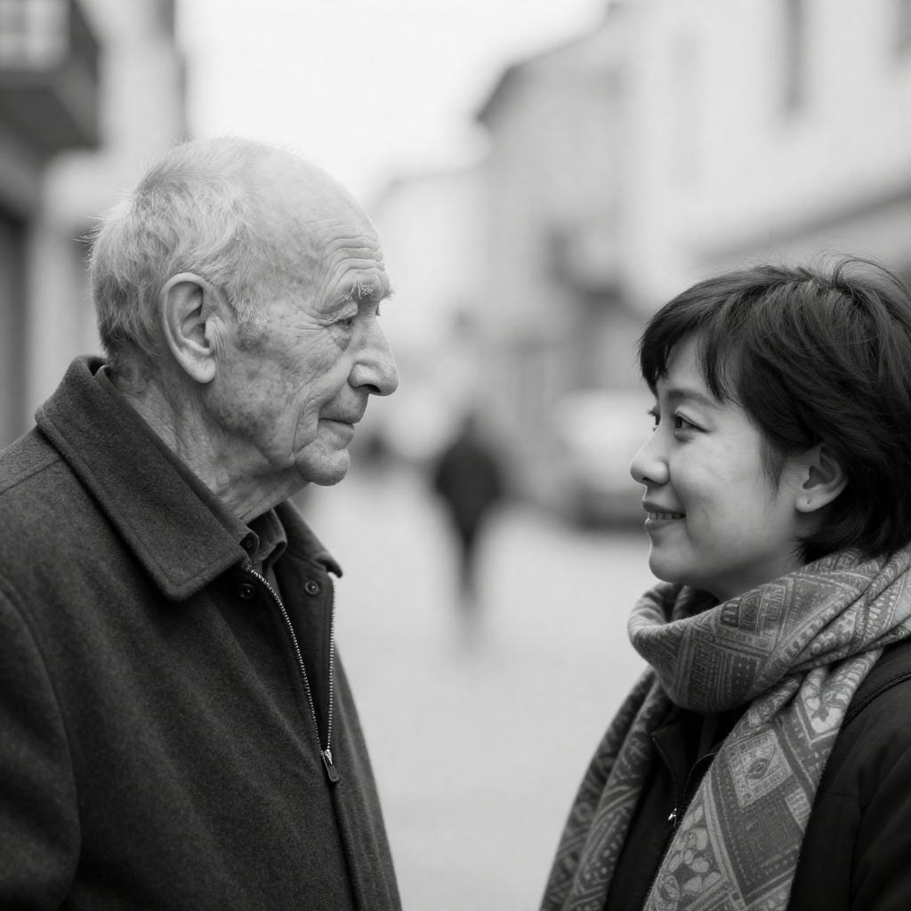 Black and white photograph showing an elderly man with thinning white hair and a dark coat standing face to face with a younger woman with short dark hair wearing a patterned scarf. Both are smiling and looking at each other with blurred urban background.