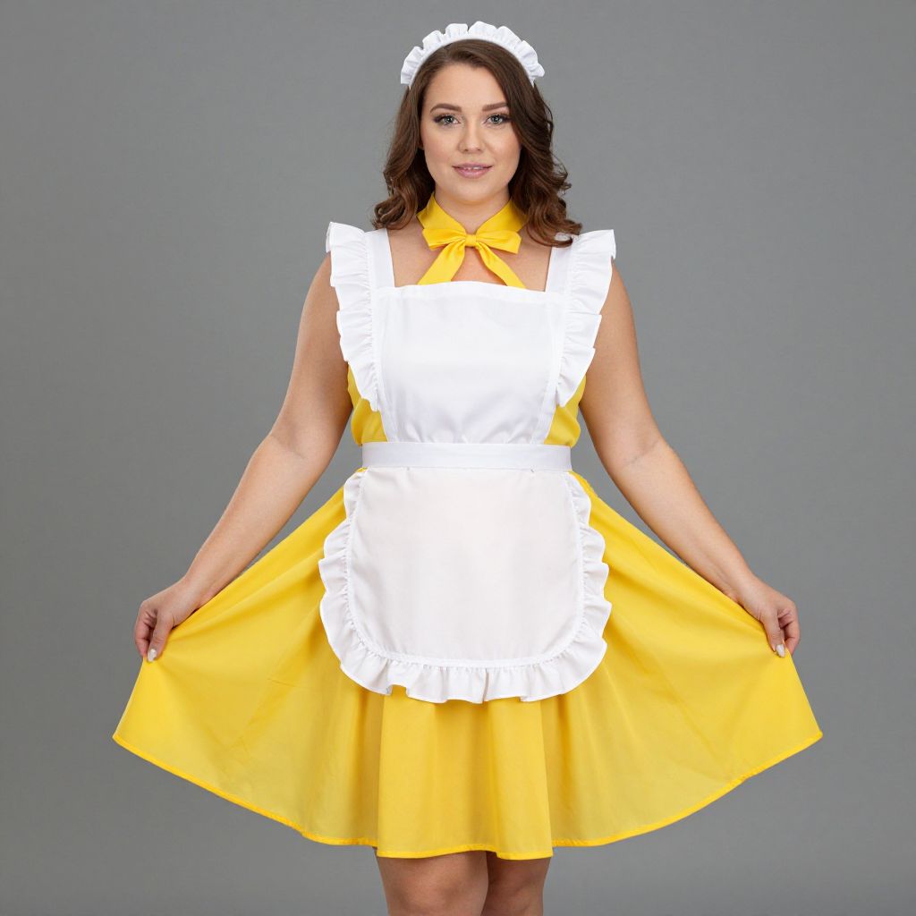 "Woman Nanny Plus Size Costume, woman in a white apron and yellow skirt"