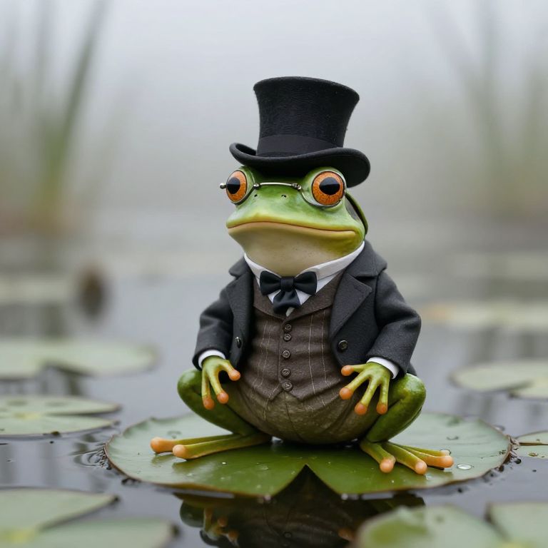 Frog wearing clothes, standing upright in a tiny Victorian suit, top hat and monocle, sitting on a lily pad in a foggy swamp, detailed, whimsical style